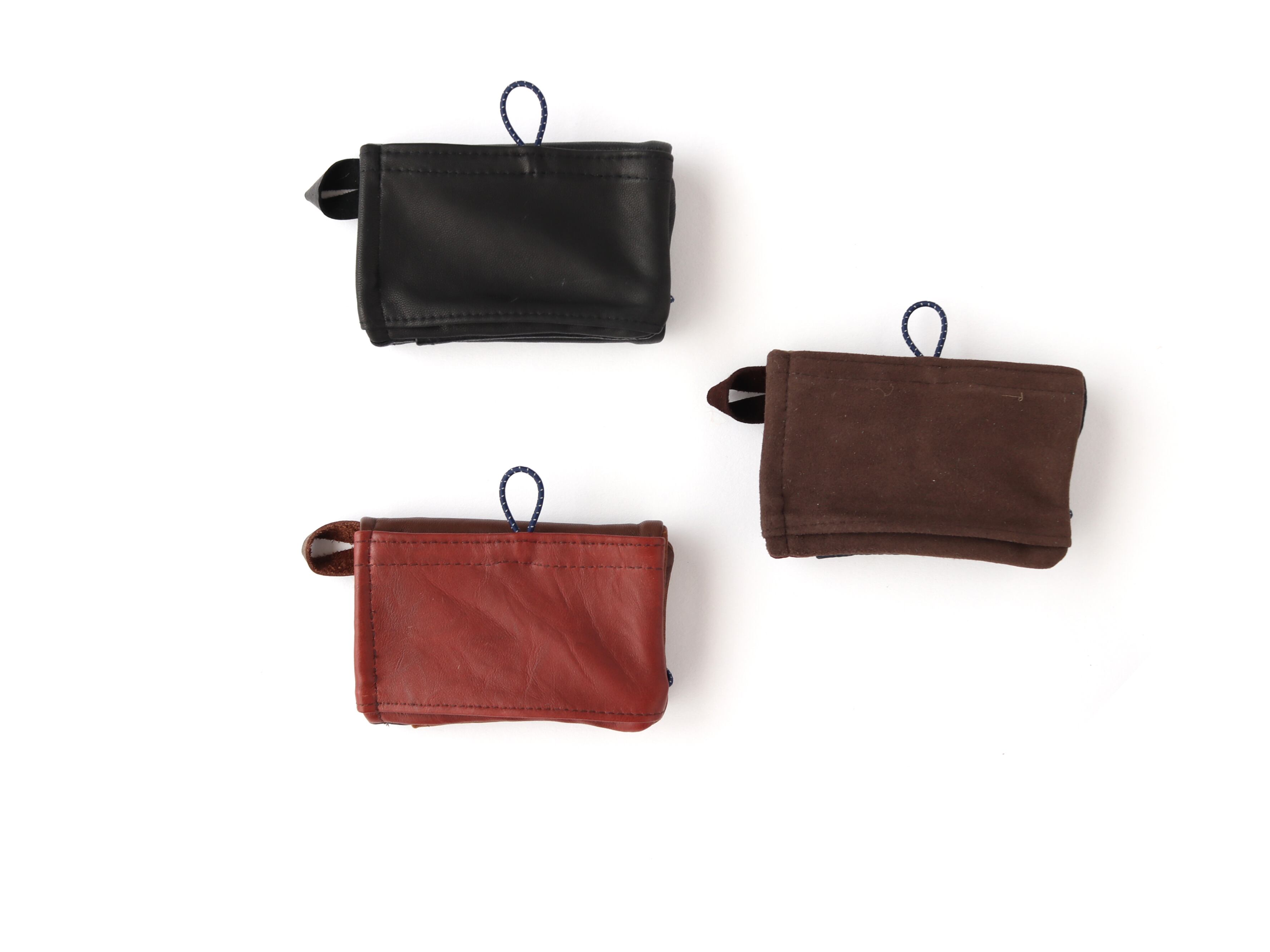 古着のレザーの端切れを解体して縫い合わせたミニ財布。手のひらサイズながら、札入れ&コイン室、3つのカード室を備え、使い勝手も上々。ループにチェーンを繋げれば紛失防止にも◎。まったく同じ表情のものはなく、唯一無二というのもリユースレザーのいいところ。使い込む程のアジも楽しめます。