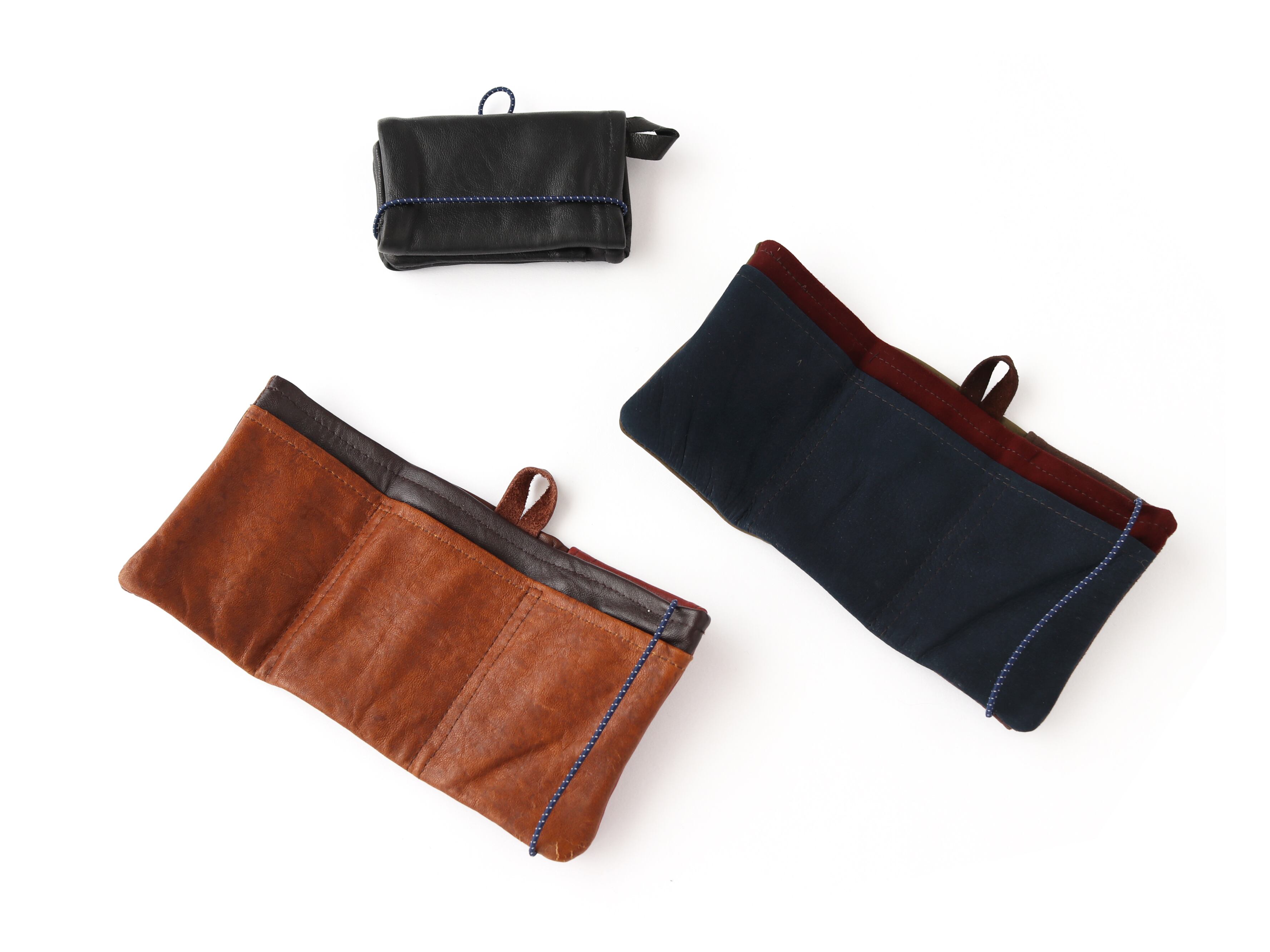 古着のレザーの端切れを解体して縫い合わせたミニ財布。手のひらサイズながら、札入れ&コイン室、3つのカード室を備え、使い勝手も上々。ループにチェーンを繋げれば紛失防止にも◎。まったく同じ表情のものはなく、唯一無二というのもリユースレザーのいいところ。使い込む程のアジも楽しめます。