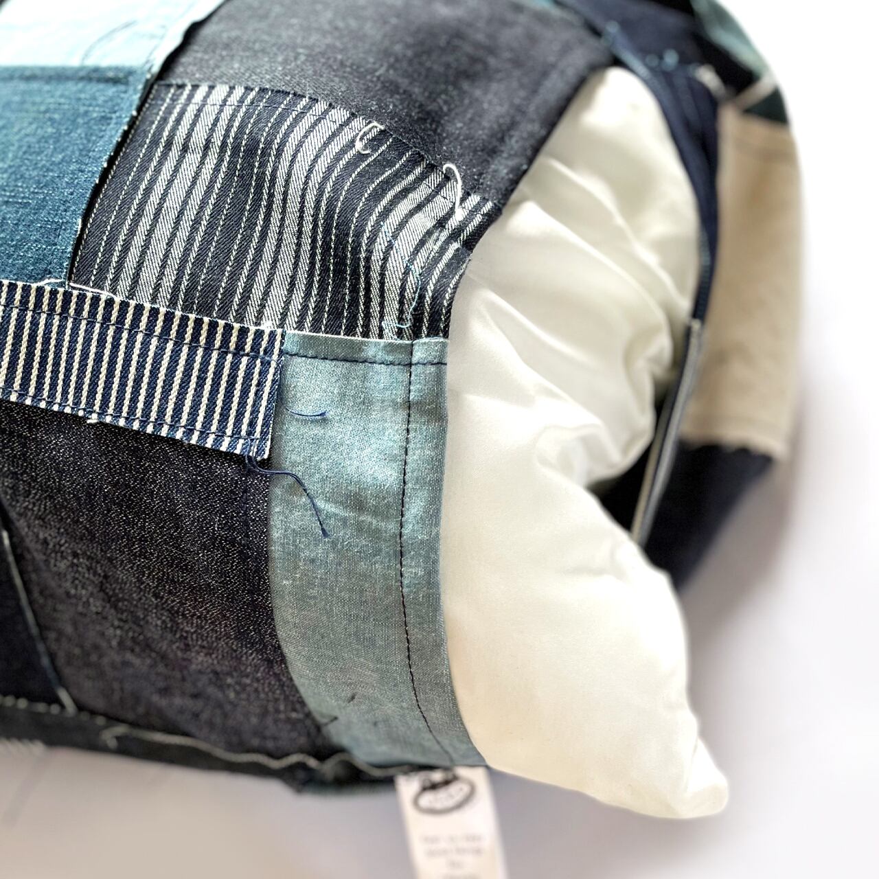 「モノを燃やさず環境に配慮しよう!」という観点から集められたユーズド衣料や、生産過程で余った端切れなどをパッチワークしてクッションカバーを作成しています。そのためデザインは全て1点もの。存在感抜群のデザインなので、インテリアのアクセントとしても威力を発揮してくれます。カバーだけではなく中材もセットになります。ぎっしり中身が詰まっており抱き心地も良いサイズ感です。