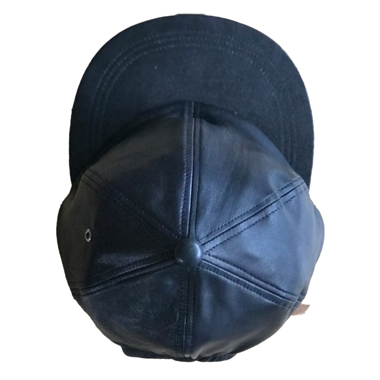 商品サンプルとして使用済みとなったレザーアイテムから切り出した生地と端切れを組み合わせて作られたレザーキャップ。