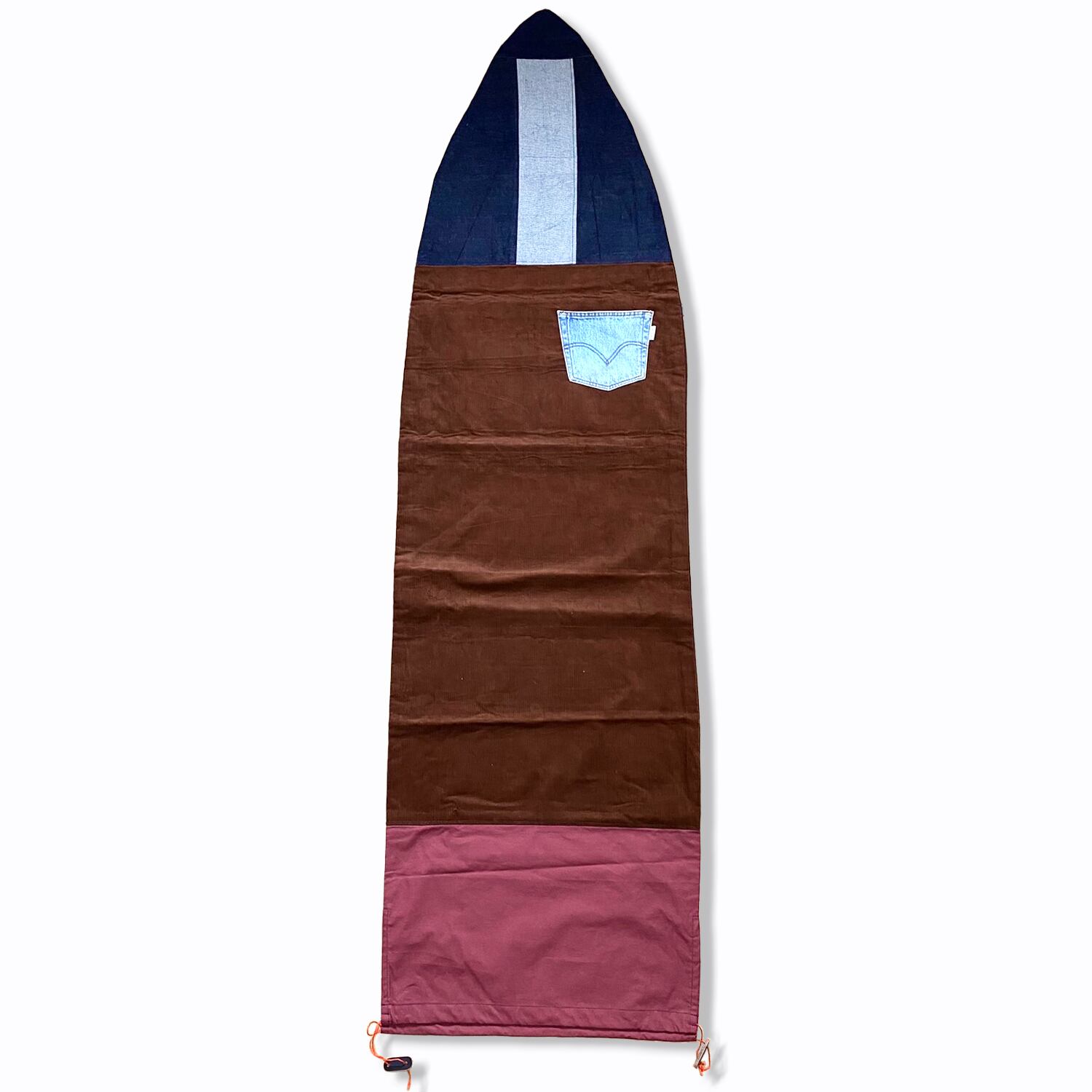 古着のデニムや縫製工場ででる生地の残反を切り出し縫い合わせた世界に一 つしかないサーフボードケース。生地自体が持つ独特なキズ 、 汚れ、色あせ感の何とも言えないぬくもりが特徴です。